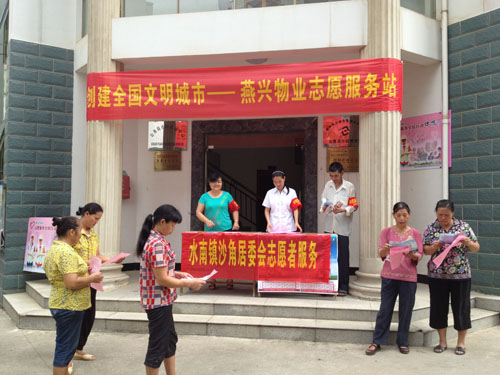 為全力配合贛州市創建全國文明城市活動,燕興物業在管轄小區內向廣大業主開展了宣傳活動,在宣傳欄內張貼了遵德守禮提示牌,在小區主大門前懸掛了宣傳文明條幅,成立了志愿服務隊,設立了“志愿服務站”。