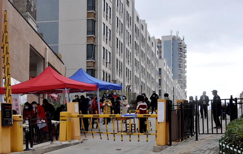 金色春城防控點(diǎn)西區(qū),小區(qū)業(yè)主外出登記和測量體溫的長長隊(duì)伍