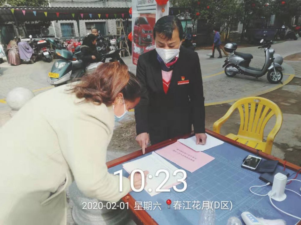 第二黨支部書記、項(xiàng)目主任邱美麗在春江花月小區(qū)對進(jìn)出人員進(jìn)行排查登記