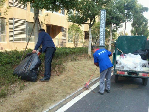 圖:象湖桃源小區保潔員在清掃道路、綠地