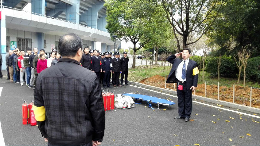 一培訓(xùn)完,參加演練的全體人員整裝列隊,在演練總指揮的一聲令下,演練正式開始。這次演練的主要內(nèi)容為通訊報警、警戒保障、疏散救護(hù)和行動滅火。現(xiàn)場模擬體育中心某處冒出滾滾濃煙,物業(yè)公司接到火警報告后,立即啟動火災(zāi)應(yīng)急處置預(yù)案,通訊聯(lián)絡(luò)組、疏散警戒組、滅火行動組、后勤救護(hù)組按照預(yù)案立刻展開行動。通訊聯(lián)絡(luò)組立即撥打119、120救援電話;疏散警戒組立刻對各路口進(jìn)行警戒封鎖,組織被困人員沿著設(shè)定的逃生路線有序撤出大樓;滅火行動組第一時間帶著消防水帶、滅火器等消防器材趕到火災(zāi)地點,將大火有效控制直至撲滅;后勤救護(hù)組對在火災(zāi)現(xiàn)場受傷的人員進(jìn)行救護(hù),傷情較重的用擔(dān)架抬出至安全地帶進(jìn)行救治……各個環(huán)節(jié)臨危不亂,環(huán)環(huán)相扣,操作嚴(yán)謹(jǐn)。
