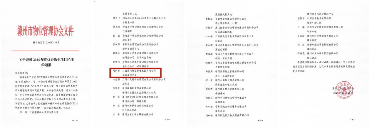 2025年元月7日,贛州市物業管理協會第五屆三次會員大會在贛州市格蘭云天國際酒店勝利召開,會上對2024年度優秀物業企業及個人進行了通報表彰。燕興物業喜獲贛州市“2024年度優秀物業企業”“2024年度誠信自律企業”“2024年度支持文明城市創建先進企業”榮譽稱號;龍南嘉和半島小區復評通過“贛州市優秀示范小區”,項目經理周群蓉喜獲“2024年度優秀物業項目經理”榮譽稱號,公園壹號小區物管員李小梅獲得“最美物業人”榮譽稱號。