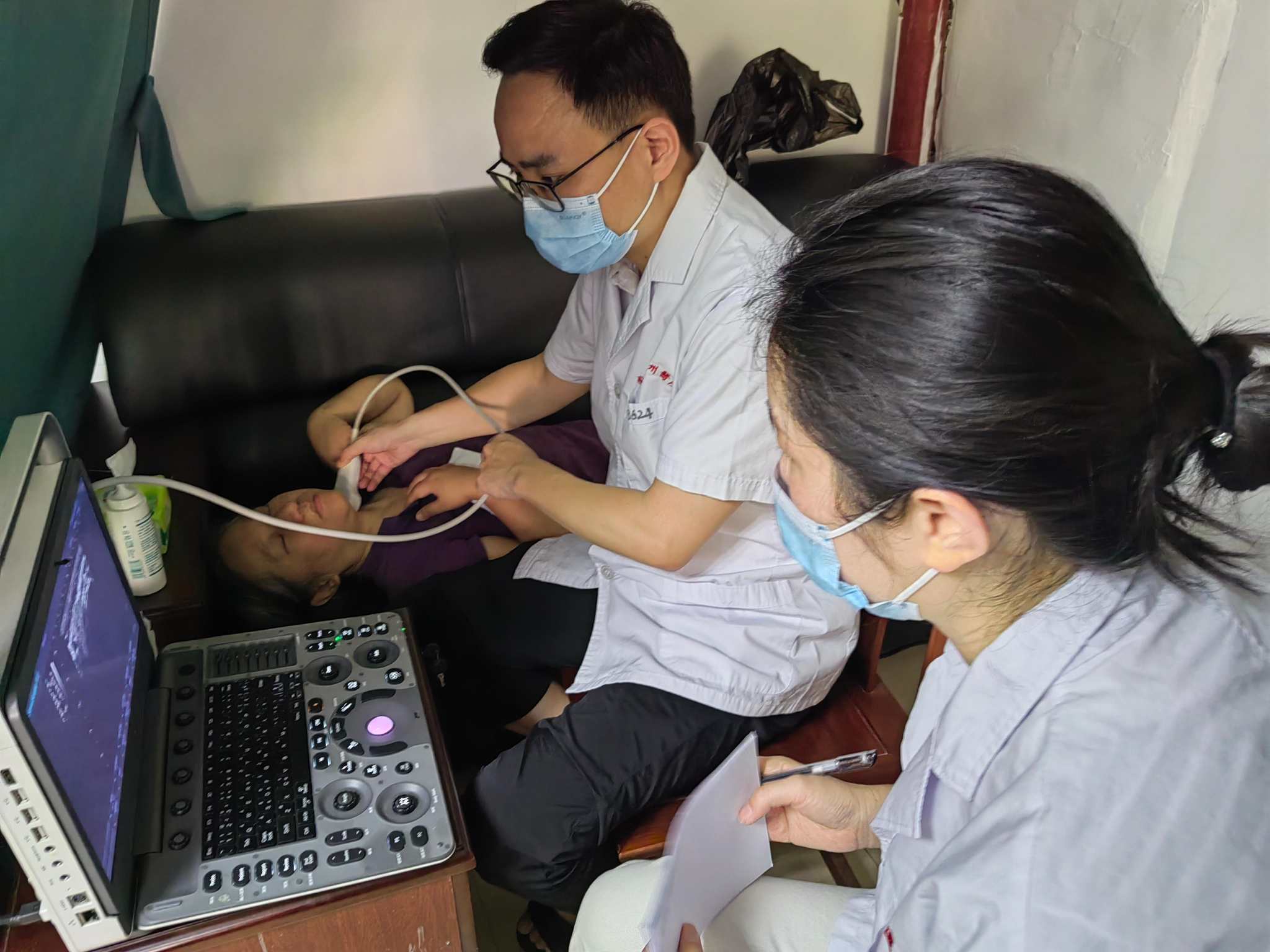 在甲狀腺彩超檢查區域,專業的超聲醫生全神貫注地操作著儀器,為居民進行細致的檢查,并結合檢查結果給予專業的建議和指導。