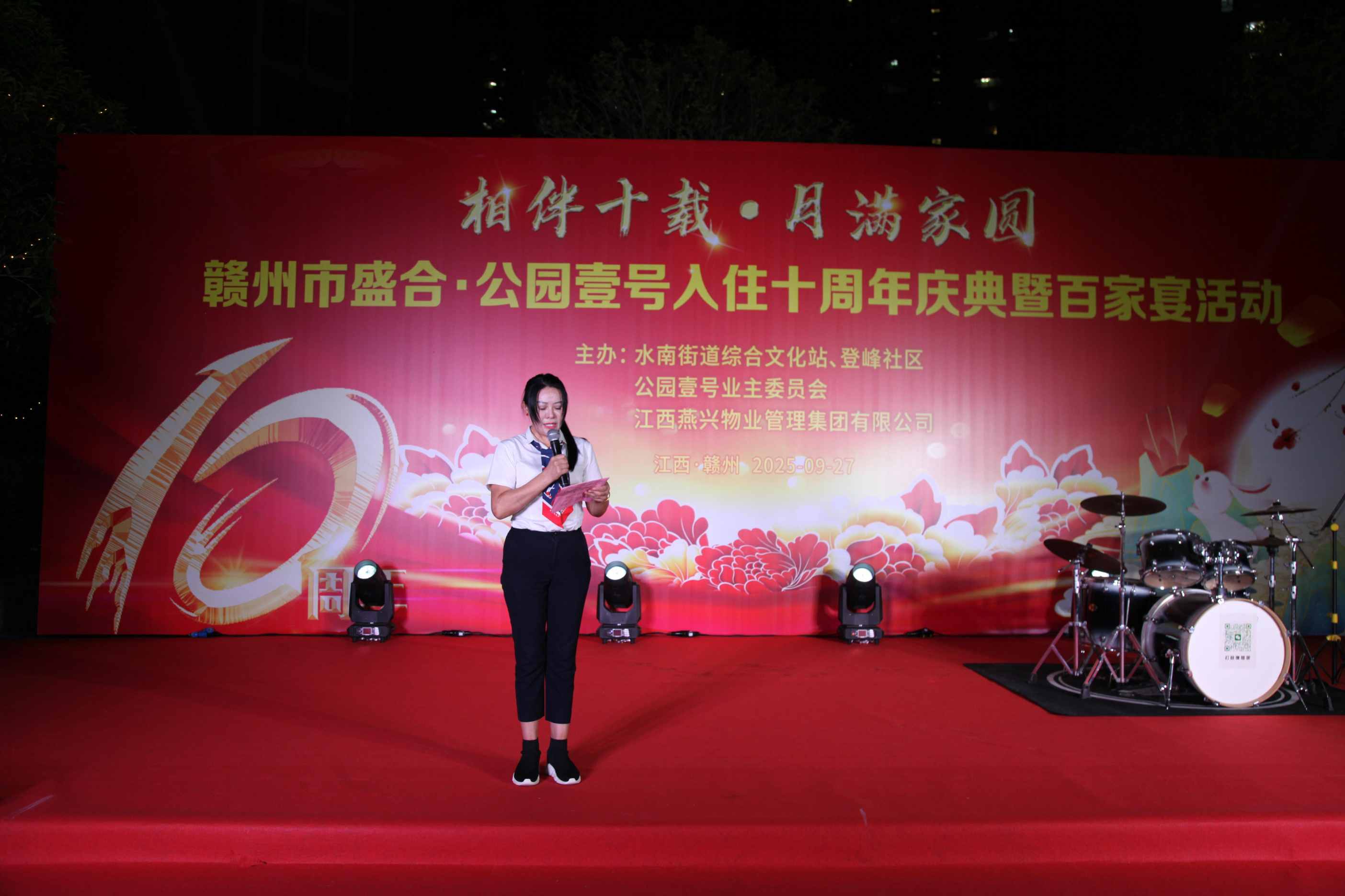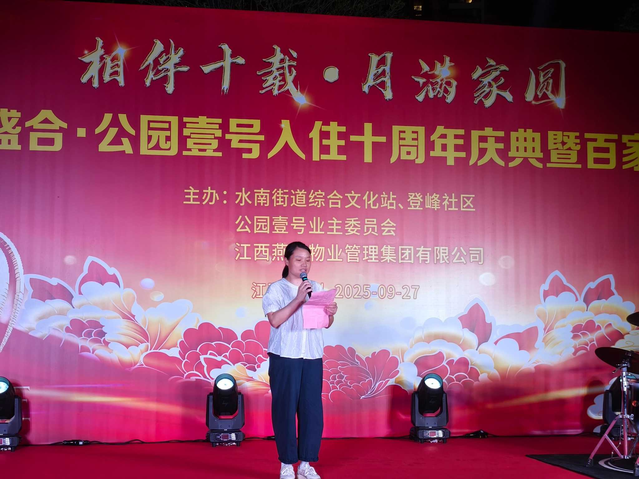金秋送爽,丹桂飄香。9月27日晚,章貢區水南街道登峰社區盛合·公園壹號小區張燈結彩、歡聲笑語,一場以“相伴十載·月滿家圓”為主題的業主入住十周年慶典暨百家宴活動溫馨上演,燕興物業集團代表和數百名業主代表歡聚一堂,共敘十年鄰里深情。