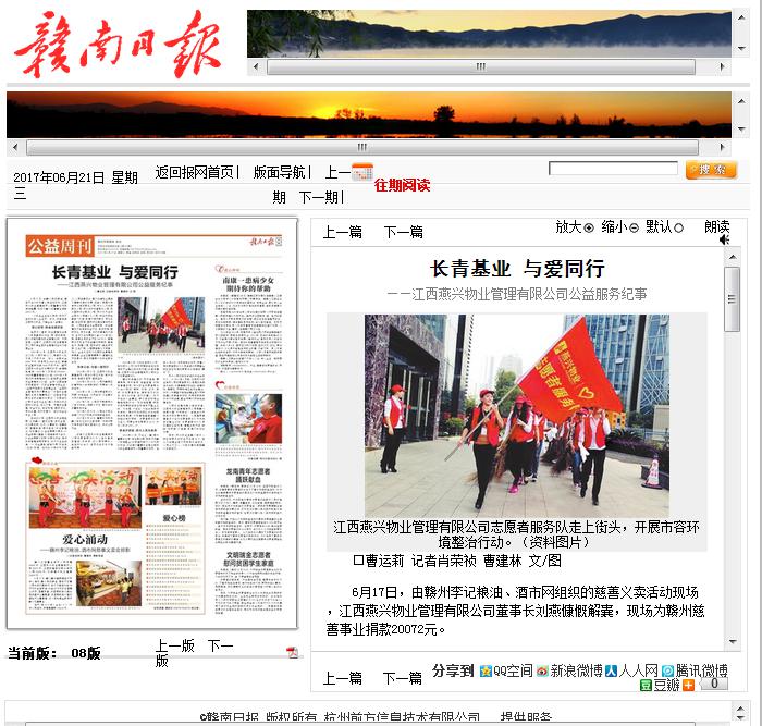 燕興物業公益服務紀事登上《贛南日報》了 2017年6月21日08版《公益周刊》刊登了《長青基業 與愛同行——江西燕興物業管理有限公司公益服務紀事》文章,如實介紹了... 2017-06-22