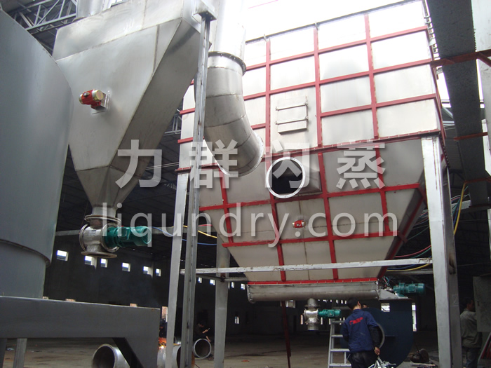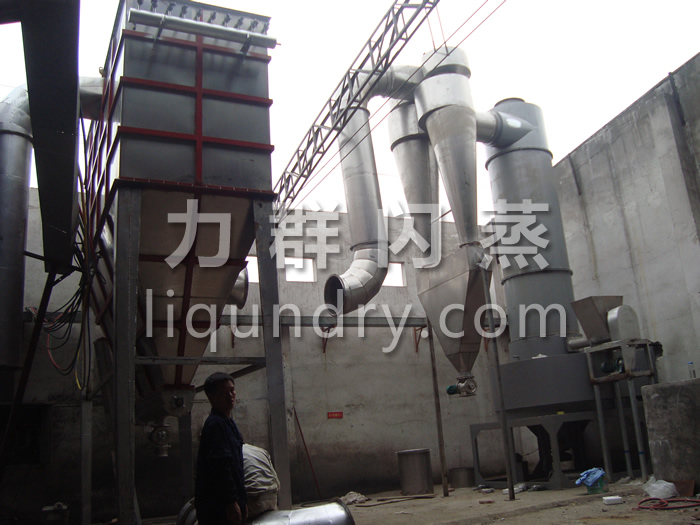 經(jīng)換熱器加熱后的潔凈空氣被鼓入進(jìn)風(fēng)口,以適宜的速度旋入干燥室底部的環(huán)隙,然后按切線方向進(jìn)入干燥室,并呈螺旋狀上升:同時,物料則由可無級調(diào)速的加料器定量加入塔內(nèi)。在干燥塔內(nèi),物料與熱空氣進(jìn)行充分、高效的質(zhì)熱變換,被干燥的粉狀物料隨同熱風(fēng)一起輸送至分離器,其中成品收集包裝,而尾氣則進(jìn)一步經(jīng)除塵裝置處理后排空。